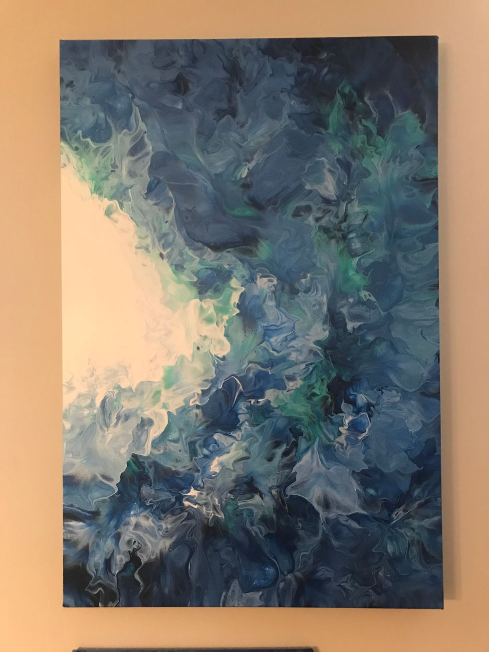 This project showcases a series of abstract paintings with blue and white color schemes, featuring swirling and fluid patterns on canvas. The paintings evoke a sense of movement and tranquility, with a focus on the interplay of color and form inspired from the waves and oceans surrounding Nantucket.